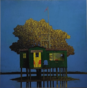 Nel mondo incantato di Tofanelli, le case non sono semplici edifici, ma custodi di storie sospese tra sogno e realtà. Le sue casette, delicate come origami, fluttuano su minuscole palafitte, isole di un blu surreale che ricorda il cielo terso di un'infanzia idealizzata.
